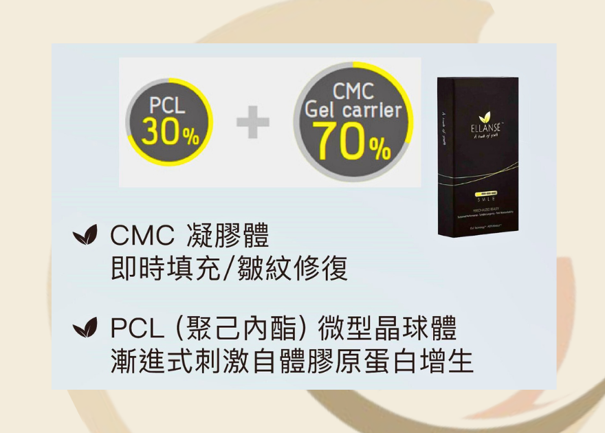 Ellanse少女針為PCL微球激生優質膠原蛋白,含有30%聚己內酯(PCL)和70%羧甲基纖維素凝膠載體(CMC),專利STAT™技術配合PCL微球,發揮即時而長效的填充及去皺效果,同時刺激皮膚內的膠原蛋白增生,從而改善皮膚質感和外觀。因此通常在一次療程後客人便能看見天然的變美效果。 Ellanse少女針成分經美國食品藥品管理局(FDA)與歐盟(CE)認證,更可完全被人體分解吸收和排出,高效安全。