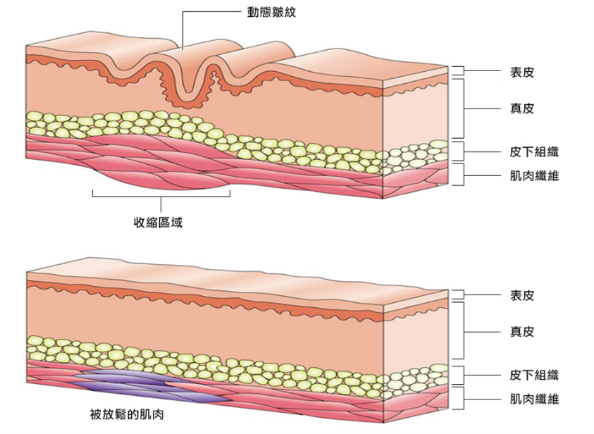 動態皺紋,包括眉心紋、額頭紋及魚尾紋是由肌肉收縮形成。神經細胞負責傳遞信號使肌肉收縮。肉毒桿菌素能有效阻截神經細胞傳送信號,有助放鬆肌肉並撫平動態皺紋。